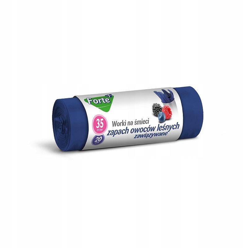 Zawiązywane zapachowe worki 35l na śmieci marki Forte+ wykonane są w 100% z surowców pochodzących z recyklingu. Pozyskane są w procesie segregacji odpadów foliowych. Praktyczne wypustki w górnej części worka pozwalają na jego szybkie i higieniczne zawiązanie oraz wygodne przeniesienie śmieci do kontenera. Zgrzew dna typu gwiazda sprawia, iż idealnie dopasowują się do różnych typów i kształtów pojemników na śmieci. Worki są grube a co za tym idzie - szczelne. Folia produkowana tą metodą uzyskuje maksymalne parametry wytrzymałościowe przy znacznie mniejszej grubości w stosunku do folii tradycyjnej. Worki posiadają przyjemny zapach owoce leśne.